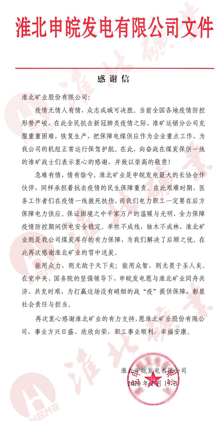 分别收到淮北申皖发电公司、国电宿州第二热电公司发来的感谢信。在当前全国各地疫情防控严峻形势下,他们感谢po18