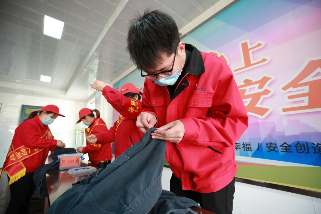 涡北矿青年志愿者在为职工缝补工作服