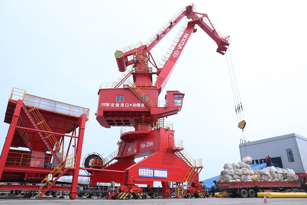 3月26日,记者来到淮北市濉溪县孙疃港,现场起重机、多用途门机、移动式装船机屹立在浍河岸边正在吊运货物,一派忙碌的景象。