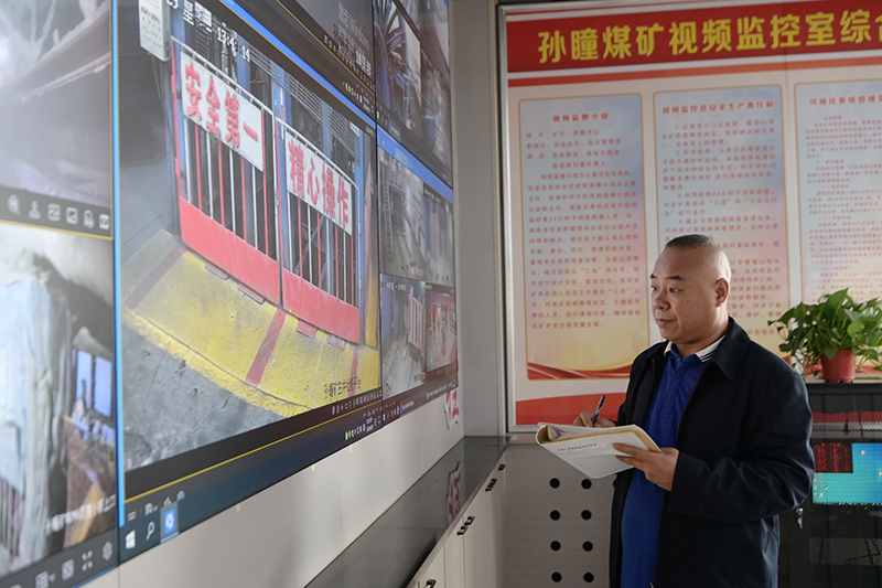 在该矿视频监控室,é¢å¯�6å—监视大å±çš„24个作业点,安监员王建两眼æ¥å›žé€¡å·¡ï¼Œç´§ç›¯å±å¹•,认真观察æ¯ä¸€ä¸ªä½œä¸šåœºæ‰€çš„è§„èŒƒä½œä¸šæƒ…å†µï¼Œæ—¶è€Œåœ¨éšæ‚£ç™»è®°ç°¿ä¸Šè®°å½•,时而拿起电è¯è”系,为矿井守好安全生产的第一é“å…³å£å¿™å¾—ä¸äº¦ä¹ä¹Žã€�