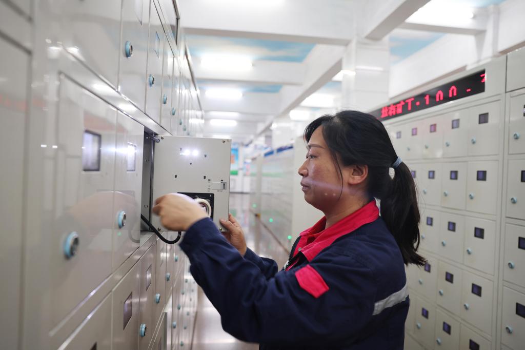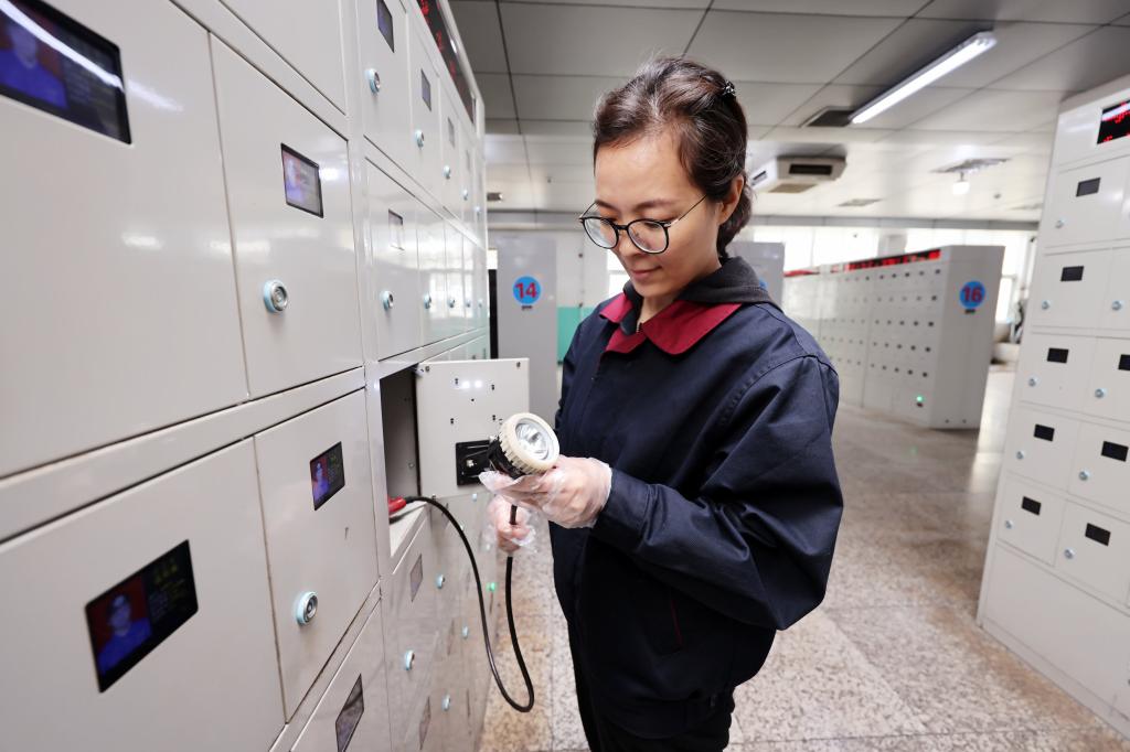 图为该矿ä¿è¿åŒºç¯æˆ¿å¥³å·¥çŽ‹æ–¹æ£åœ¨æ£€æŸ¥çŸ¿ç¯å……电情况ã€�
