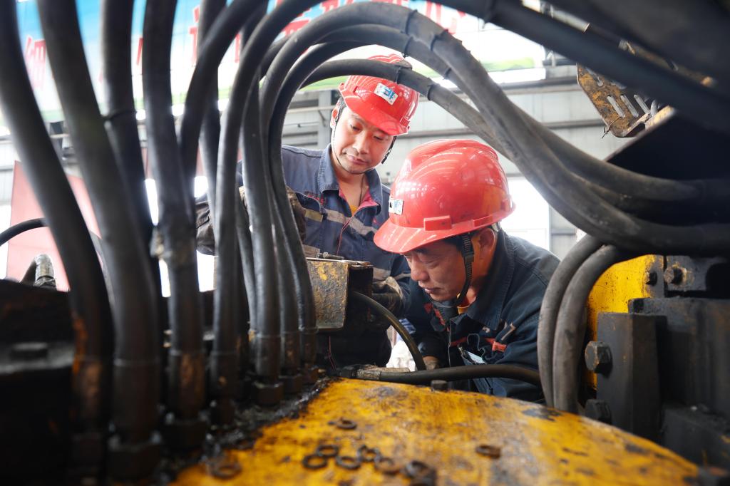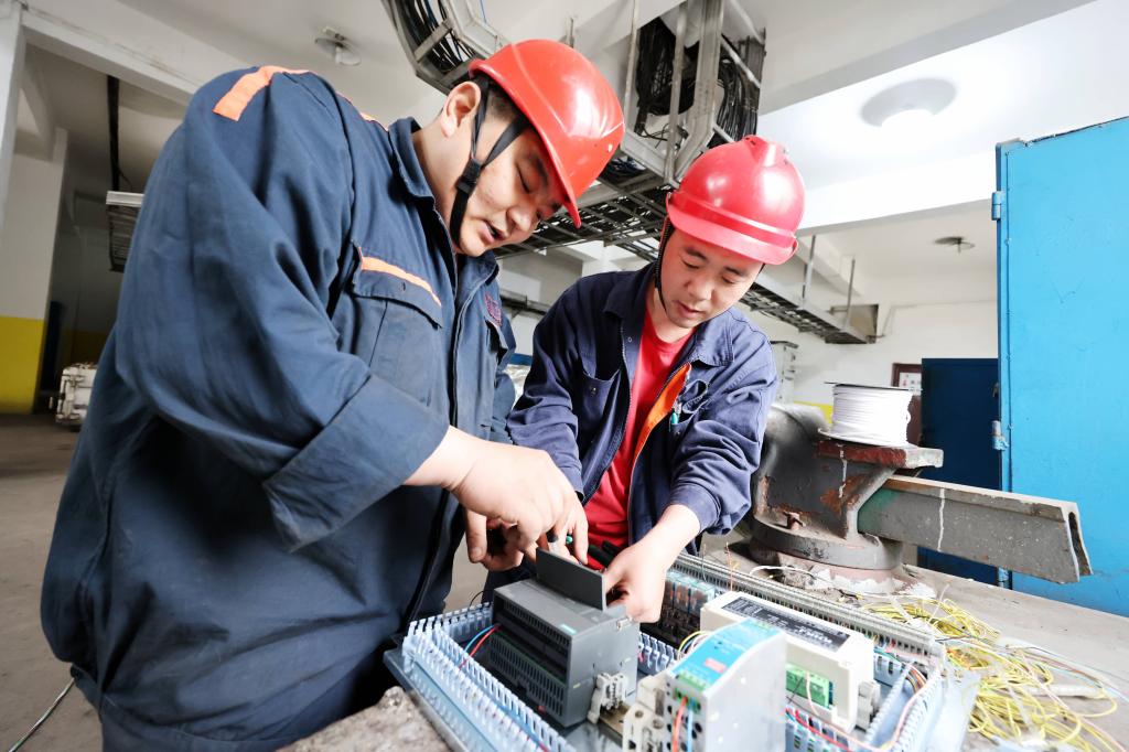 图为机电科机修工胡天彬和戴é“锤æ£åœ¨ç»´ä¿®å•è½¨åŠæ°”动é“å²”