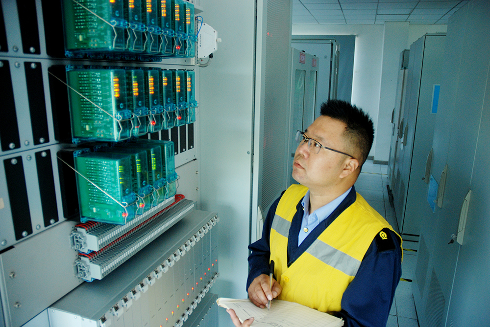 图为临涣电务段信å·é¢†å·¥åŒºé¢†å·¥é•¿çŸ³ç£ŠæŸ¥çœ‹ä¿¡å·è”锿œºæˆ¿ä¿¡å·é›†ä¸ç›‘测系统è¿è¡Œæƒ…å†�