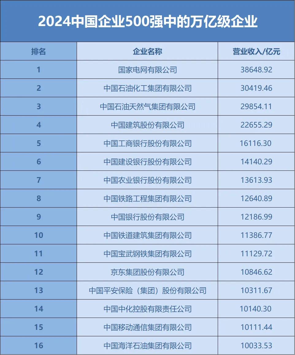 2024中国企业500强中,营业收入超�1000亿元的企业数量为253家,占比超过50%;有16家企业营业收入超过了1万亿元�