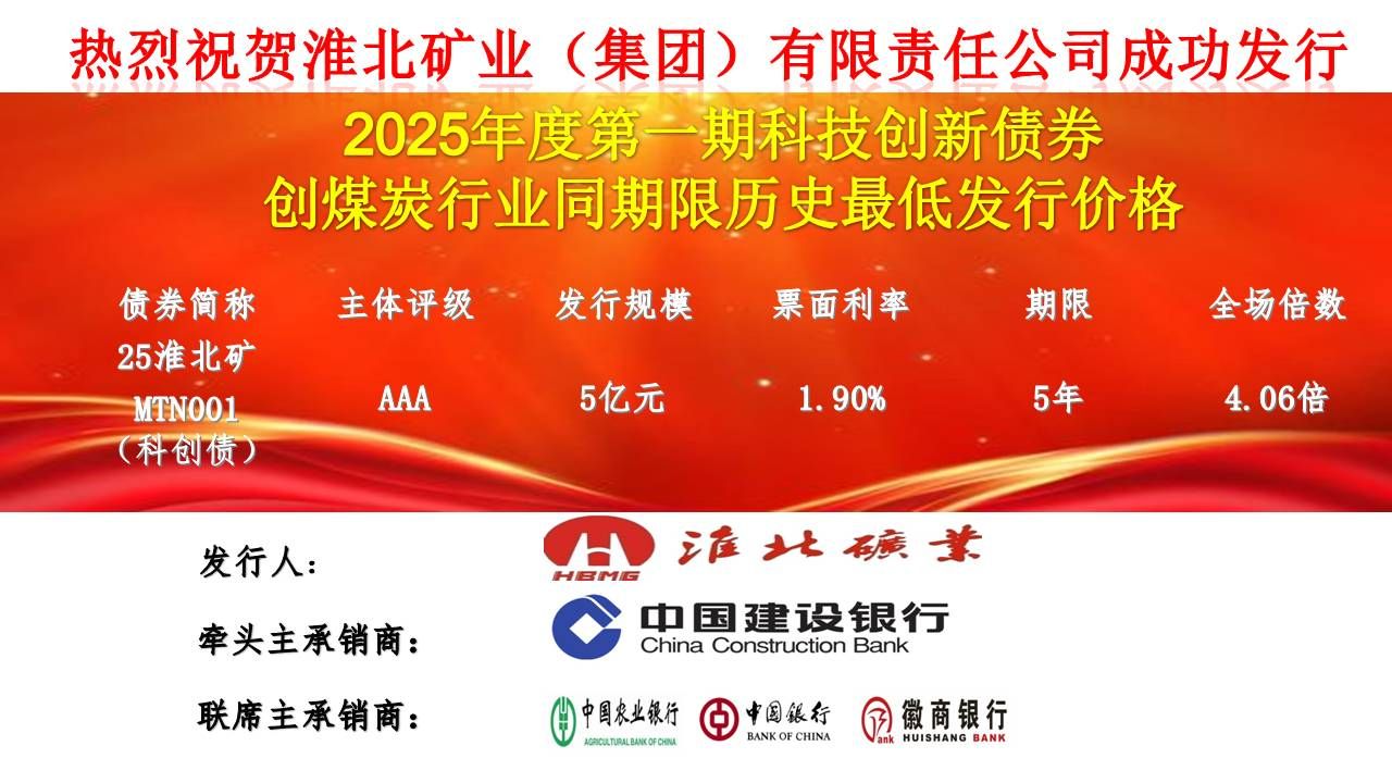在银行间市场成功发行2025年第一期科技创新债券——25淮北矿MTN001(科创债),发行规模5亿元,期限5年,票面利率1.90%,全场认购倍数4.06倍,创煤炭行业同期限债券价格最低、集团债券票面利率新低,充分显示资本市场对po18