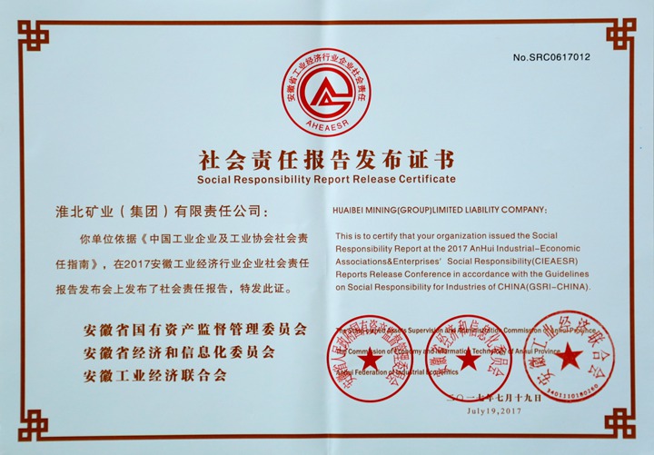 在发布会发布的《2017安徽省企业社会责任报告综合评估报告》中,对淮北矿业主动调整产能,不断延伸产业链,积极开发新能源,发展非煤企业,在困境中走出一片新天地的做法给予了积极肯定。