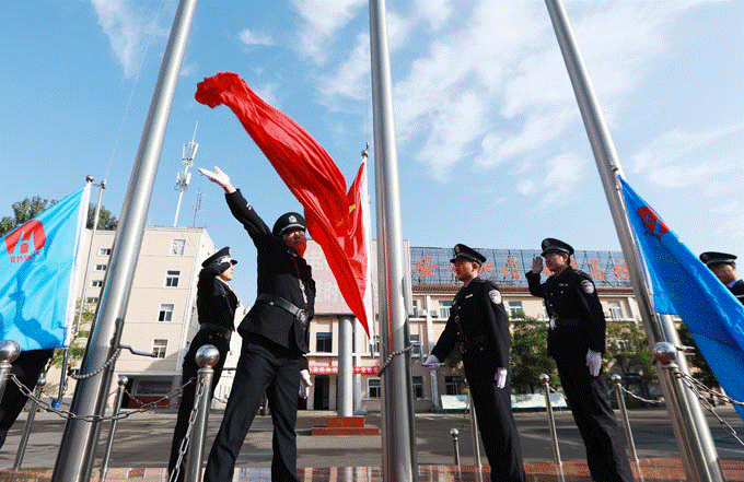 在高亢嘹亮的《æŒå”±ç¥–å›½ã€‹ä¹æ›²å£°ä¸ï¼Œå›½æ——护å«é˜Ÿæˆå‘˜è¿Žç€æœé˜³ï¼Œè¿ˆç€é“¿é”µæœ‰åŠ›çš„æ¥ä¼ï¼ŒæŠ¤å«ç€äº”星红旗走å‘凿——å°ã€‚ä¼´éšç€é›„壮豪迈的国æŒå£°ï¼Œé²œè‰³çš„五星红旗冉冉å‡èµ·ï¼Œè¿Žé£Žé£˜æ‰¬ã€‚å¹¿å¤§å¹²ç¾¤ç¥žæƒ…åº„ä¸¥è‚ƒç©†ï¼Œå±æ¯å‡è§†ï¼Œé¢å‘国旗行注目礼,共åŒç¥æ„¿ä¼Ÿå¤§ç¥–å›½æ›´åŠ ç¹è£æ˜Œç››ã€�
