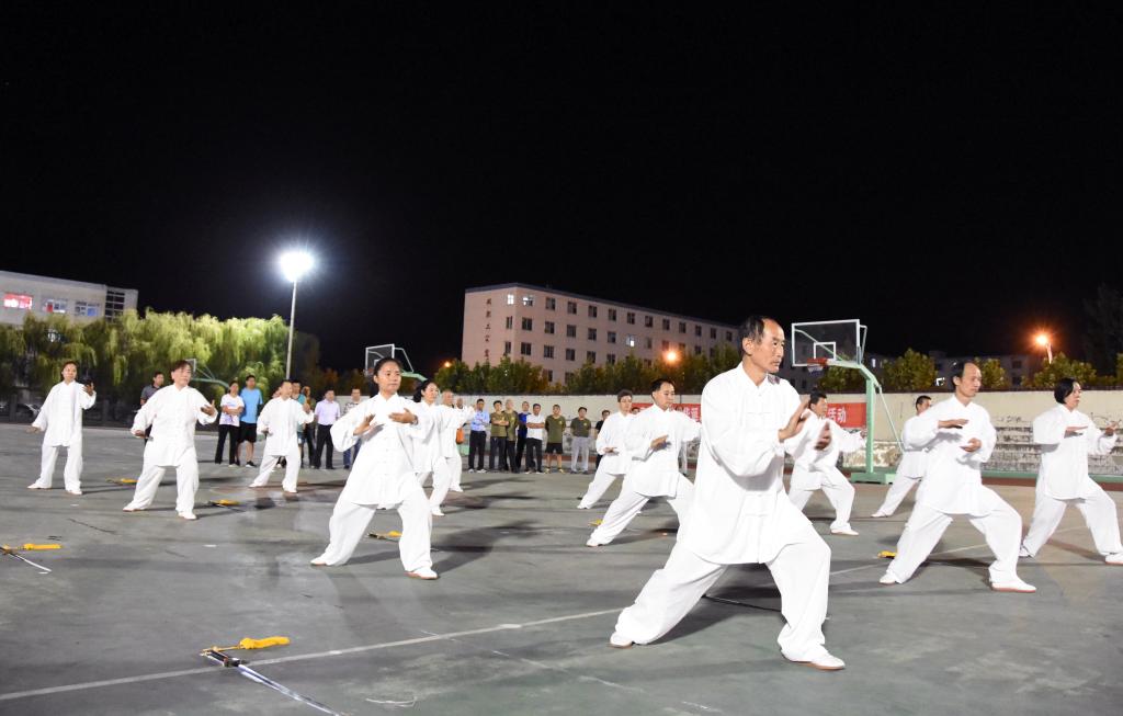 国庆æ¥ä¸´ï¼Œä¸ºè¥é€ 浓厚节日氛围,è¢åº—一矿组织ç–划了“为祖国贺å²â€ä¸»é¢˜ç³»åˆ—æ–‡ä½“æ´»åŠ¨ï¼Œåº†ç¥æ–°ä¸å›½æˆç«�70周年。图ä¸�9æœ�26日晚,è¢åº—ä¸€çŸ¿å¤ªæžæ‹³çˆ±å¥½è€…èŒå·¥åœ¨ä½“育场进行“庆åŽè¯žã€å±•风采ã€ä¿å®‰å…¨â€å¤ªæžæ‹³ã€å¤ªæžå‰‘表演,展示矿区èŒå·¥æ˜‚扬å‘上的精神风貌,å¸å¼•了众多èŒå·¥é©»è¶³è§‚çœ‹ã€‚ï¼ˆå¼ ç›¼ç›¼ï¼‰