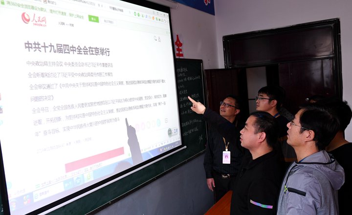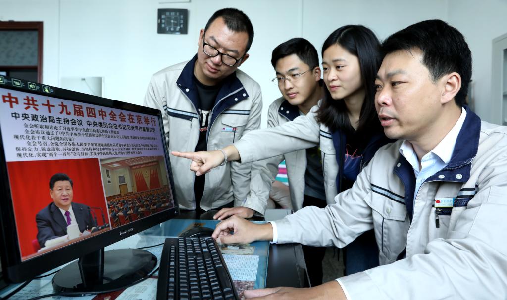 11�1日,童亭矿党群工作部人员通过电脑、手机客户端观看中国共产党第十九届中央委员会第四次全体会议公报。(高加� 摄)