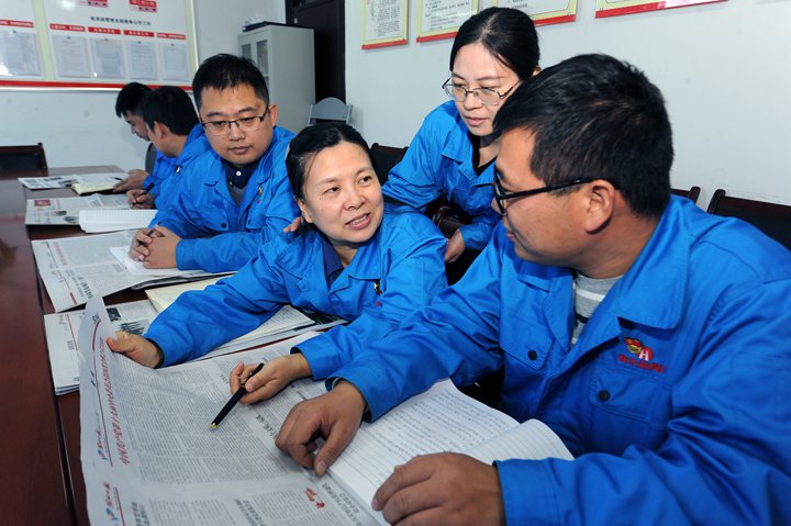 11�1日,在淮北选煤厂政工党支部党员活动室内,党小组成员正在学习刚刚下发的中国共产党第十九届中央委员会第四次全体会议公报。该厂党员干部在全会公报公布后,通过各种途径第一时间学习公报精神,深入了解党的建设科学制度体系、总体目标、重大战略任务等内容,以党的最新理论武装头脑,指导实践,推动工作。(韩晓� 摄)