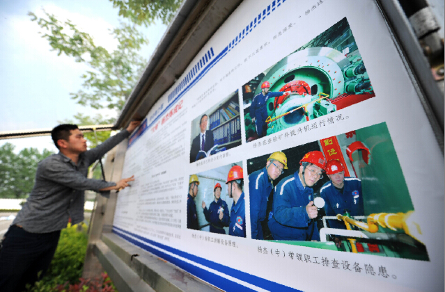 袁店二矿工作人员正在赶制典型人物灯箱牌。五一期间,该矿把“全国重大宣传典型人物”杨杰的先进事迹制作成宣传画,展示在工广主干道,引导职工学习先进、争当先进。