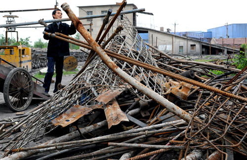 5月4日,朱仙庄矿武保科门卫班一名职工正在将回收的废旧物资进行集中存放。该矿把聚焦双效指标层层落实到科区、班组和职工个人,做到“人人肩上有责任,人人头上有指标”,在职工中形成了“聚焦双效、我的责任”、“聚焦双效、从我做起”的良好氛围。