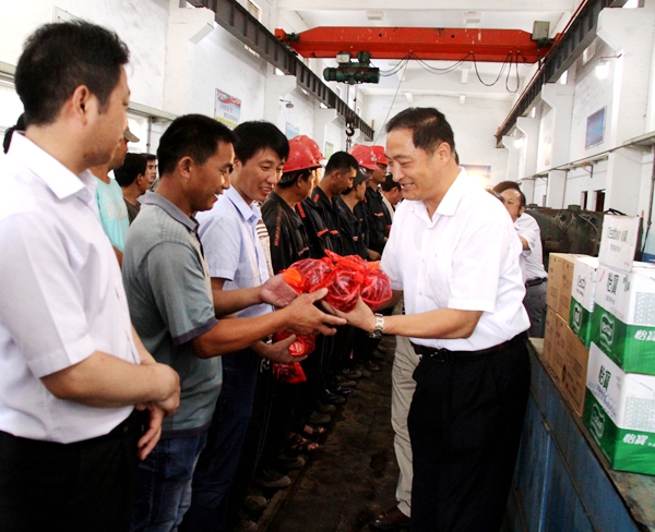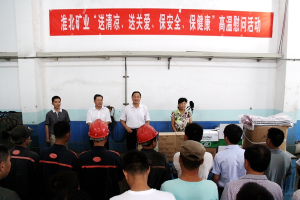 上午10点钟,在芦岭矿有关人员的陪同下,淮北矿业工会负责人一行来到芦岭矿运输区充电房,就开展“送清凉、送关爱、保安全、保健康”慰问活动的目的意义及当前面临的严峻经营形势任务和压力进行了阐述和说明,叮嘱越是在高温季节越要关心职工的生活、休息和安全,要让职工休息好,保证职工有充沛的精力用心每一天,干好每件事。特别在当前的经营形势下,芦岭矿全体干群要树立战胜困难的勇气和信心,认真落实好淮北矿业下半年工作会议精神,严格执行好三个“十条规定”,紧紧围绕淮北矿业开展的“四个零”的任务目标,严格现场管理,严格任务落实,严格责任追究,严格瓦斯、防突和“一通三防”管理,进一步提高矿井的抗灾能力,努力实现芦岭矿更长的安全周期。随后,淮北矿业工会负责人向在场的干部职工发放了慰问品,希望大家在高温期间,以安全规程和有关制度严格要求自己,不违章、不蛮干,严格操作规程,搞好联保互保,确保矿井安全生产。