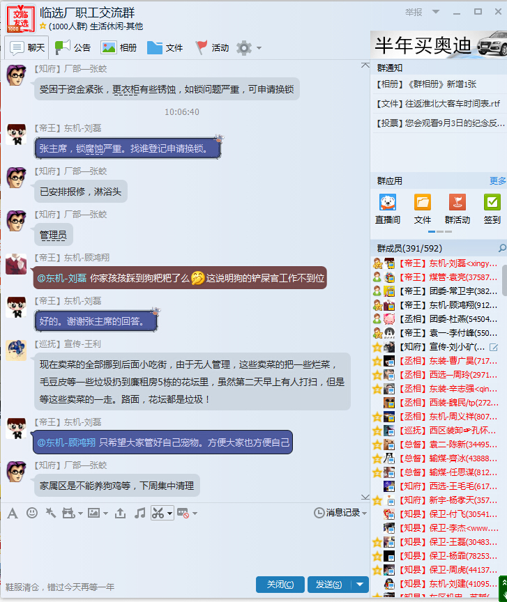 “张主席,乘车卡、饭卡、洗浴卡能否三卡合一”、“澡堂淋浴头损坏得多、更衣柜锈蚀严重”、“家属区还有养鸡养狗现象,扰乱社区文明秩序”,8月28日,临选厂职工QQ交流群里你一言、我一语。一问才知道,原来是该厂工会主席张蛟正在尝试运用“互联网”渠道开展信访民主接待日。