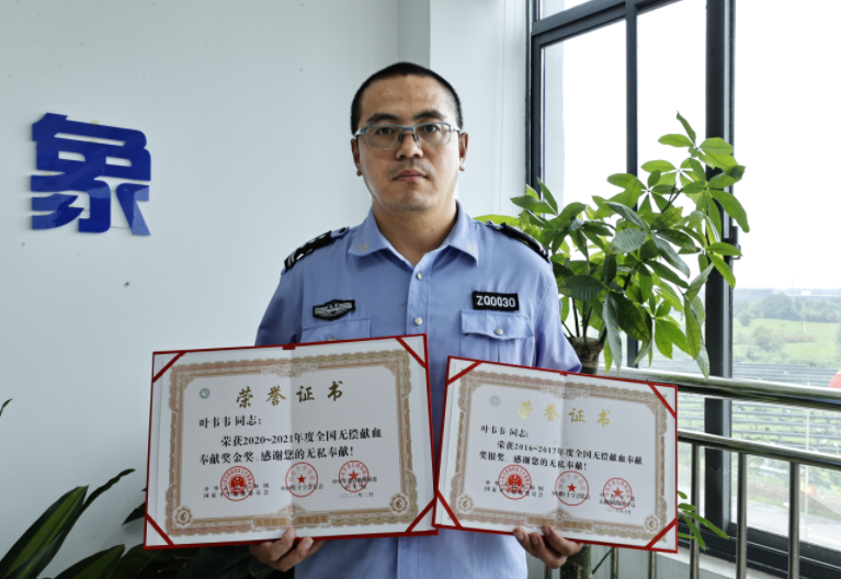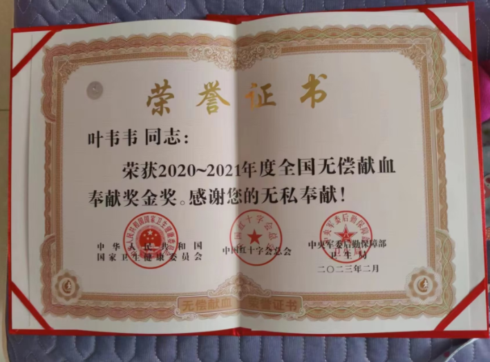 无偿献血奉献奖是由国家卫生健康委员会、中国红十字总会和中央军委后勤保障部卫生局三部门联合颁发,献血量累计6000毫升以上得银奖,累计8000毫升以上得金奖。今年年初,在统计2020-2021年度献血员献血量当中,叶韦韦由于累计献血总量达到8000毫升,被授予无偿献血奉献奖金奖证书。