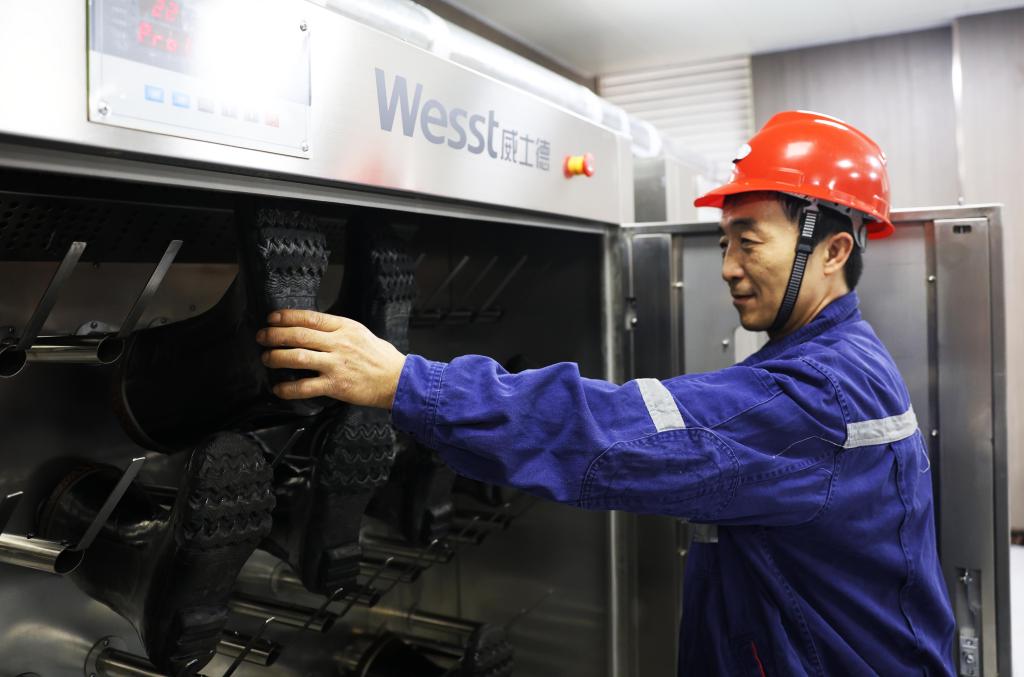 据了解,该矿此次总共投入运行五台智能胶靴烘干机。职工在洗刷区把清洗干净后的胶靴放入机器内,只需轻轻按下启动按钮,便可实现胶靴加热、除湿、除臭和杀菌等多种效果。