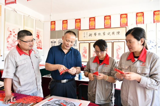 陈国斌力求剪纸艺术的传承与创新,广泛传播剪纸艺术,采取工作室随时开放、随时学习、义务教学等形式,通过亲手剪、亲自做、亲身体会,让剪纸艺术飞入寻常百姓家,深受广大职工群众的青睐。他还多次参加文化惠民活动,并走进社区、学校、军营进行授课,以匠心守初心,义务传授弟子几十人,遍及20多家厂矿,培训学生700多人次。
