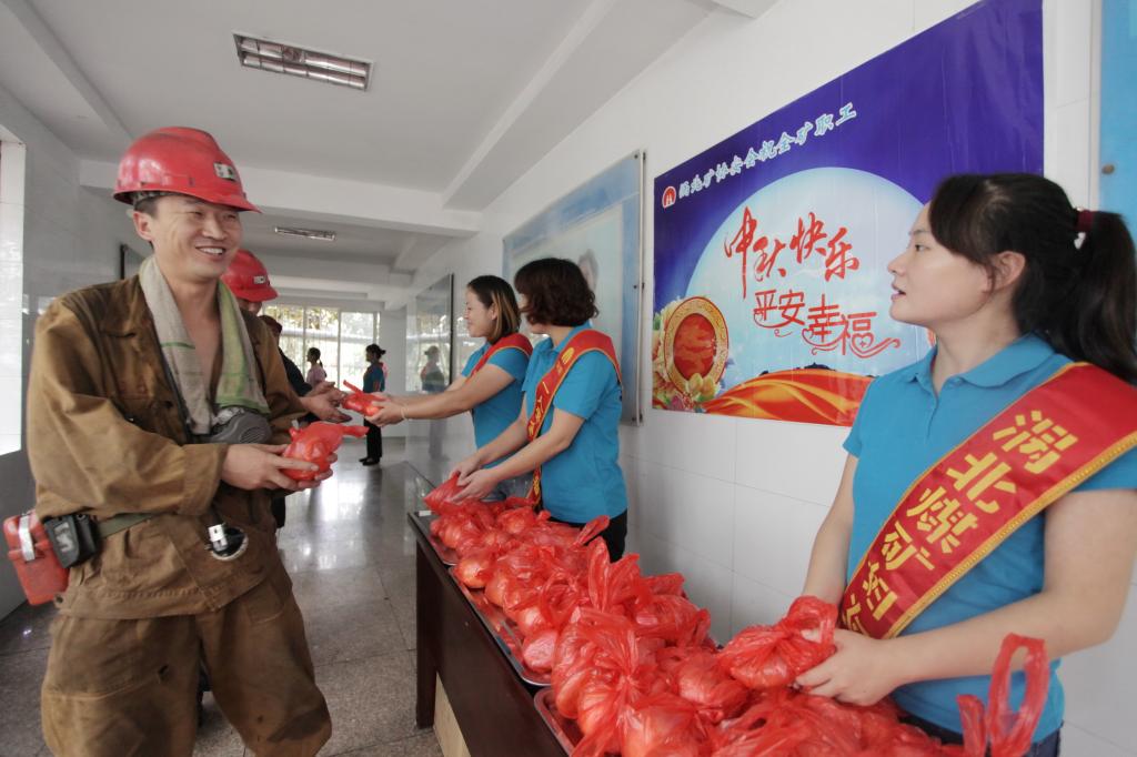 为了能让在节日期间仍坚守在工作岗位的矿工师傅感受到节日的氛围和矿上的关怀,牢记安全嘱托,9月27日中午与晚上,该矿工会组织妇女协安员们带着香甜的月饼和苹果来到井口开展“中秋月圆送平安”慰问活动,为上下班的职工送去一份节日礼物和亲情关怀,协安员们把一块块代表平安、团圆的月饼递到上下井的职工手中,并提醒大家将安全牢记心间,按章作业,做好自保互保工作。