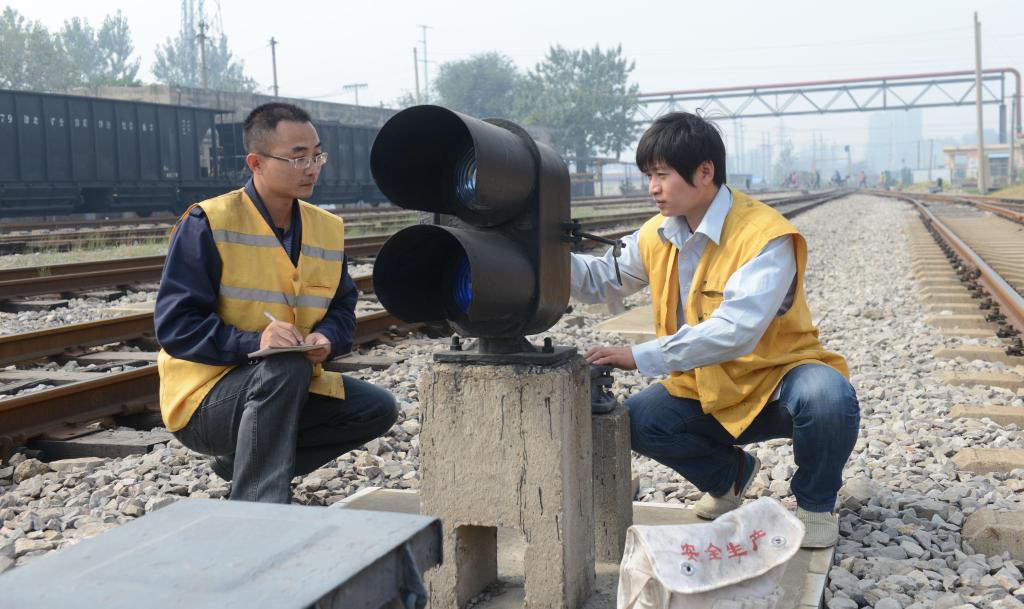 图为 信号工仔细检查信号设备