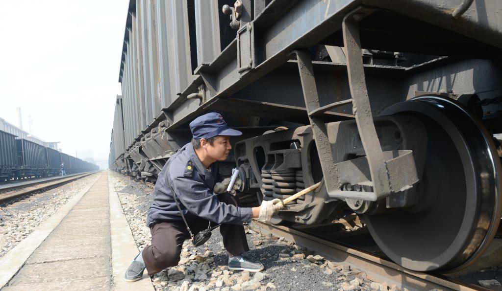 图为 检车员仔细检查车辆故障