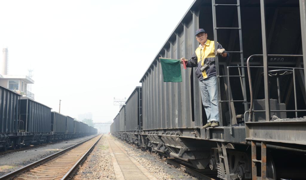 图为 调车长在牵引车辆运行