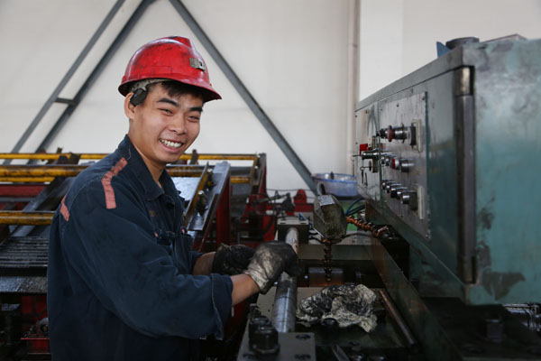 锚杆车间职工葛新矿正在对生产线进行调试。国庆节当天,他们生产锚杆6900根。