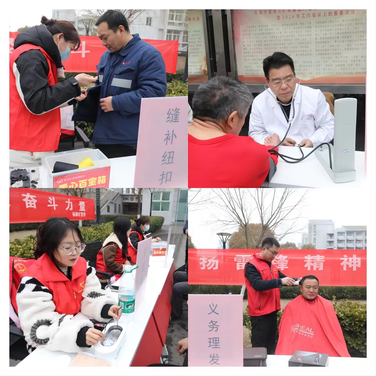 职工食堂门口,红色的身影忙碌了起来。志愿者们摆好桌椅,拿出准备好的剪刀、推子、血压仪、纽扣针线、鞋油鞋刷、手机膜等物品,支起一个个爱心“小摊子”,热火朝天地开启了义务理发、血压测量、手机贴膜、眼镜清洗、缝补纽扣、皮鞋护理、政策解读宣讲等多项志愿服务活动。