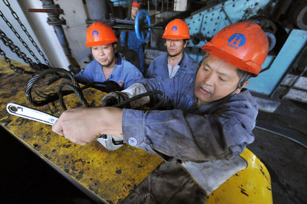 10月12日,淮北选煤厂维修人员正在更换卧式沉降离心机部件。该厂提前备战冬季洗煤生产,把加强设备缺陷整改当做重点工作来抓,针对设备防寒防冻的重点部位和薄弱环节制定严密的防范措施,保障冬季选煤生产。