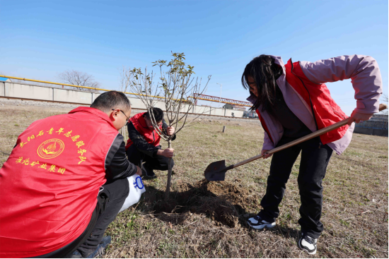 春回大地万物苏,植树添绿正当时。3月8日,在第46个植树节来临之际,袁店二矿党团志愿者们迎着和煦的春风,踩着明媚的阳光,前往矸石山修复区,参加“同植青年林 共建新袁二”植树活动,共同栽下桂花、海棠等多个品种新苗百余棵,以实际行动为打造“责任、效率、平安、精美”新袁二再添一片绿。(审核:王多顺)