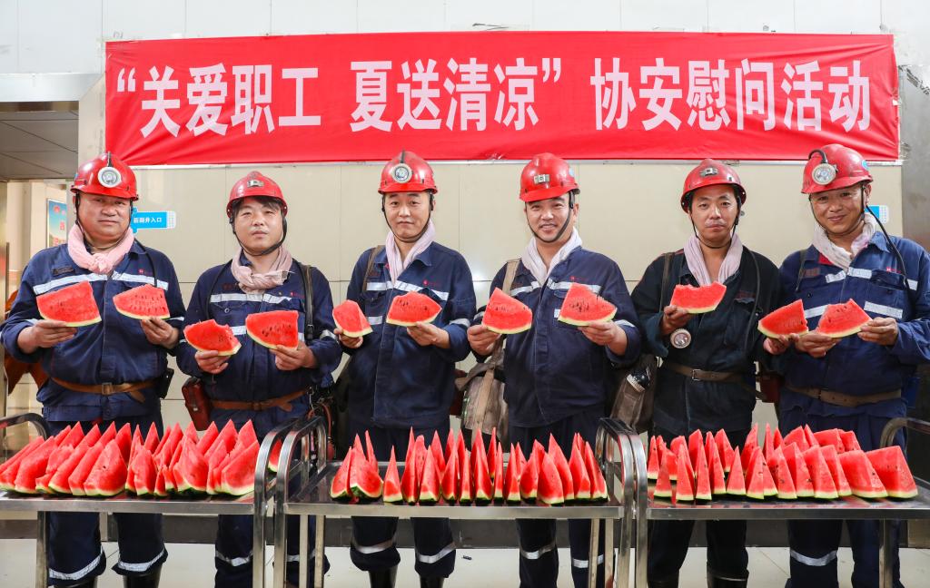 近日,为保障高温天气下职工能够全身心地安全投入到生产工作中去,临涣选煤厂持续开展“夏日送清凉、情满安全月”慰问活动,为职工送去纯净水、盐汽水、西瓜等解暑降温物品,全力做好高温天气下的防暑降温、安全生产工作,助力“安全生产月”活动开展。