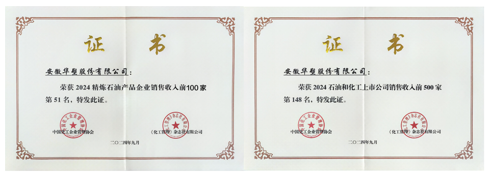 日前,由中国石油和化学工业联合会指导、《化工管理》杂志社具体承办的“2024石油和化工企业销售收入前500家”榜单公布,安徽华塑股份有限公司位列“2024精炼石油产品企业销售收入前100家”第51位和“2024石油和化工上市公司销售收入前500家”第148名。