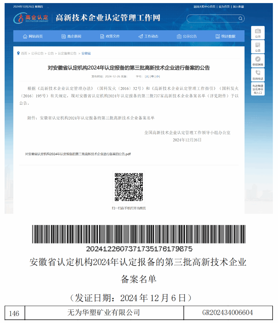 日前,全国高新技术企业认定管理工作领导小组办公室公布安徽省认定机构2024年认定报备的第三批1024家高新技术企业名单,华塑股份无为华塑矿业有限公司榜上有名。这是无为华塑自2018年以来第三次获得国家“高新技术企业”称号。