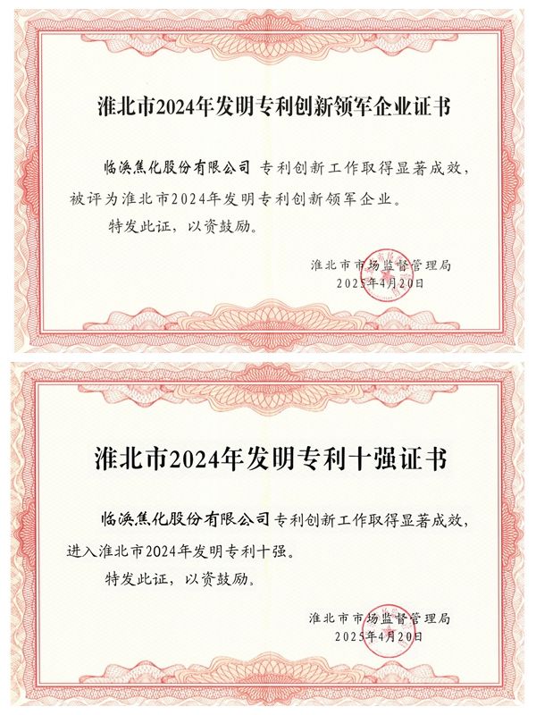 日前,从淮北市市场监督管理局传来喜讯,临涣焦化公司获评淮北市“2024年发明专利创新领军企业”和淮北市“2024年发明专利十强”两项荣誉称号。