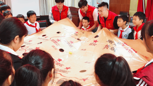 活动还设置了沉浸式互动环节。在重走长征路游戏中,孩子们分组协作,齐心运送“长征火种”,在一次次的尝试中体会百折不挠的意志品质;在我们一起来阅兵环节中,孩子们在青年志愿者的协助下开启“国防武器盲盒”,将组装完成的模型整齐排列、模拟阅兵,深刻理解“落后就要挨打”的历史教训与“强国必须强军”的时代意义。简单的游戏形式,承载的是对红色基因的生动传承。