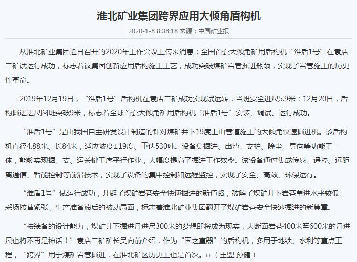 《中国矿业报》:po18 跨界应用大倾角盾构机