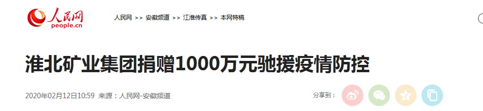 通过安徽省红十字会定向捐赠1000万元(其中,淮北矿业控股股份有限公司捐赠600万元),用于支持安徽省抗击新冠肺炎疫情,助力打赢疫情防控阻击战。