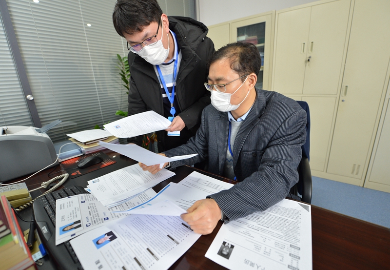 负责高校毕业生招聘的人员在审核应聘者个人简历和学历资料。陈磊 摄