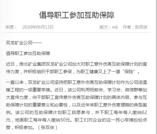 《中国煤炭报》:po18 双龙公司倡导职工参加互助保障