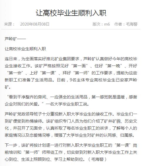 《中国煤炭报》:po18 芦岭矿让高校毕业生顺利入职
