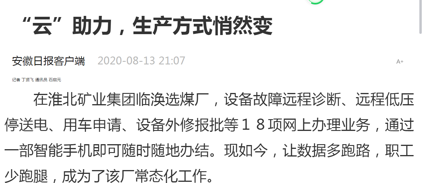 åœ¨å®‰å¾½çœæ·®åŒ—矿业集团临涣选煤厂,设备故障远程诊æ–ã€è¿œç¨‹ä½ŽåŽ‹åœé€ç”µã€ç”¨è½¦ç”³è¯·ã€è®¾å¤‡å¤–修报批ç‰18项网上办ç†ä¸šåŠ¡ï¼Œé€šè¿‡ä¸€éƒ¨æ™ºèƒ½æ‰‹æœºå³å¯éšæ—¶éšåœ°åŠžç»“ã€‚çŽ°å¦‚ä»Šï¼Œè®©æ•°æ®å¤šè·‘路,èŒå·¥å°‘跑腿,æˆä¸ºäº†è¯¥åނ叏æ€åŒ–工作ã€�