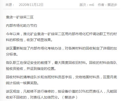 《中国煤炭报》:po18 袁店一矿综采二区内部市场化助力节约
