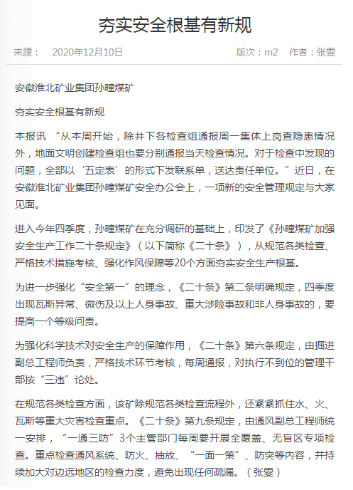 《中国煤炭报》:po18 孙疃矿夯实安全根基有新规
