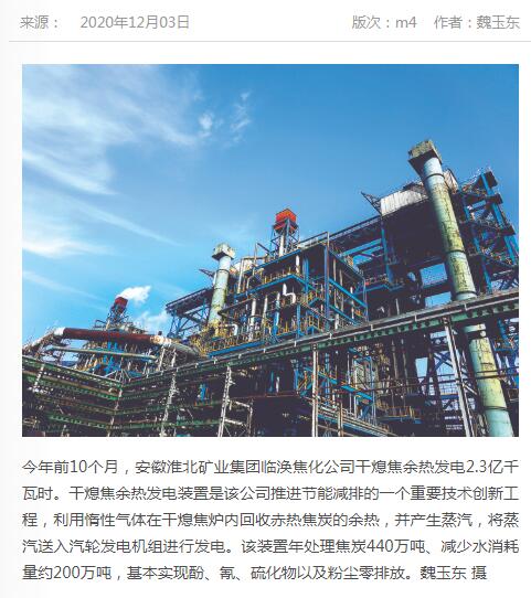 《中国煤炭报》:po18 临涣焦化公司基本实现废气污染零排放