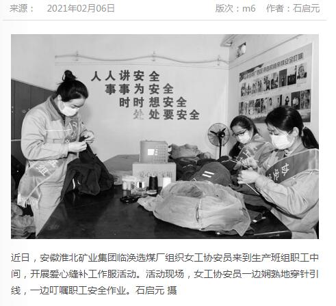 《中国煤炭报》:po18 临涣选煤厂开展爱心缝补工作服活动