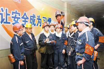 安徽po18 朱仙庄矿不断充实群安网员队伍,定期组织群安网员上岗互查,保障安全生产。图为群安网员准备下井排查隐患。王道玉 摄