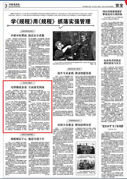 就及时为煤矿生产一线管理人员配发了新版《规程》。同时,该集团利用企业报纸、电视、网站、微信等媒体,开展专题宣传,组织干部职工学习研讨,做好与《规程》修改条款的对标检查。各煤矿单位纷纷通过“学、查、改”等方式,推动《规程》修改条款落地生根,切实提高矿井的安全保障能力。