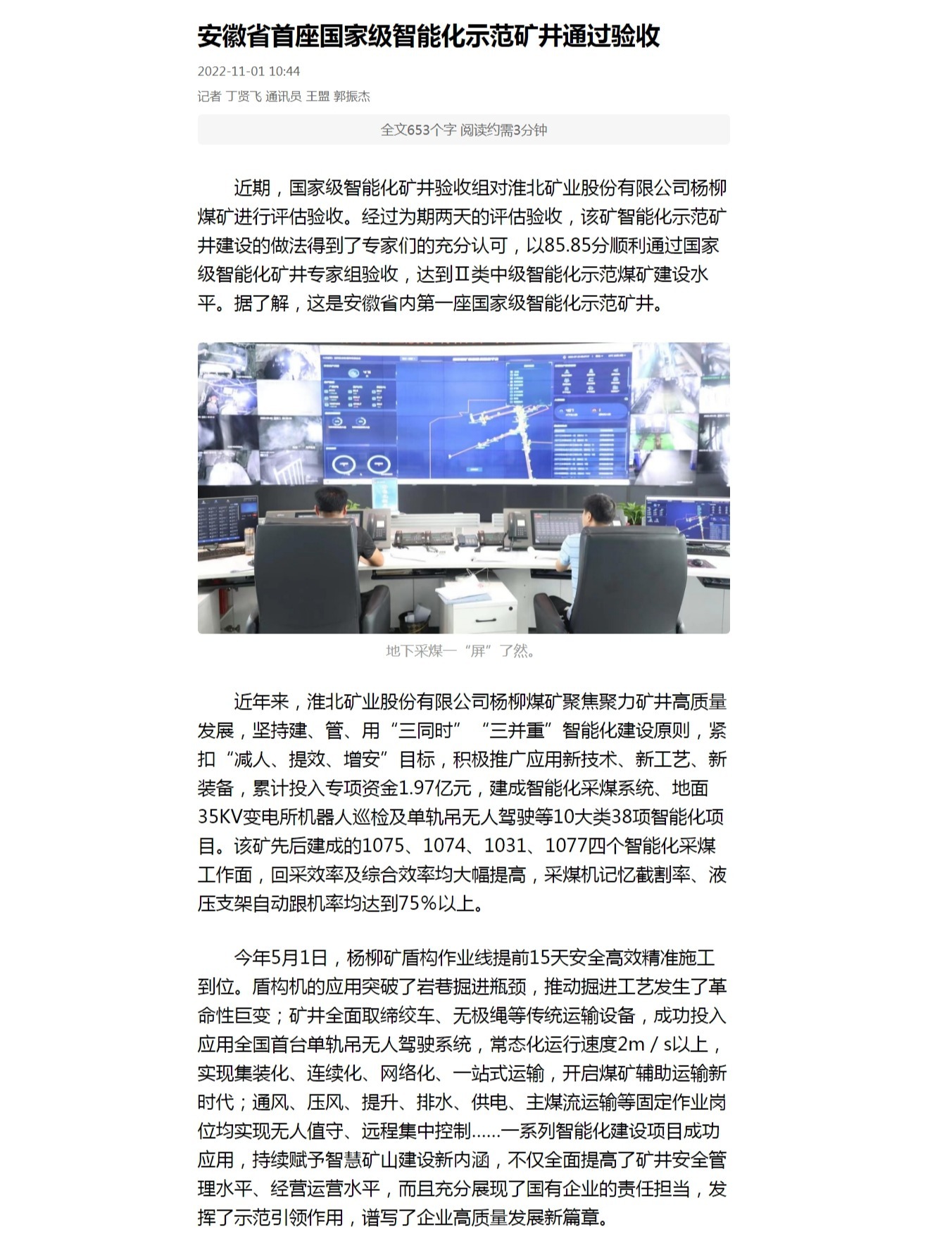 《安徽日报》:安徽省首座国家级智能化示范矿井通过验收