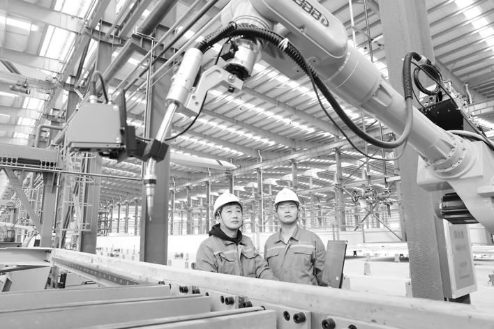 日前,安徽po18 “十四五”发展规划重点项目——安徽绿厦智建公司智能建造项目“板架合一”装配式钢结构建筑构件智能生产线进入生产试运行阶段。图为11月3日,两名员工对操作地轨七轴焊接机器人进行焊前校正。(乔时庆 摄)