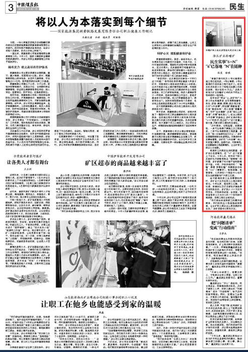 在年初矿“两会”上,该矿向广大职工作出郑重承诺,全年将围绕餐饮、洗浴、安居、健康、便捷、娱乐等方面,办好“6件实事”,即创建“满意食堂”、打造“星级浴池”、用心搭建“温馨港湾”、守护“生命健康”、乐享“指尖上的幸福”、尽情“愉悦身心”。在全力做好“6件实事”的基础上,该矿还表示将以“6+N”的形式,努力在“N”这个变量上做文章,不断为职工增加民生福祉。