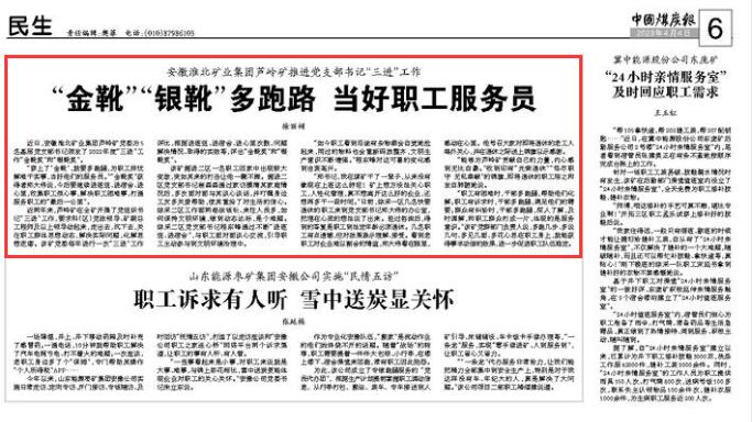 近两年来,芦岭矿在全矿开展了党组织书记“三进”工作,要求科(区)党政领导、矿副总工程师及以上领导动起来,走出去,沉下去,关注职工群体思想动态,解决实际问题,化解思想疙瘩。该矿党委每年进行一次“三进”工作评比,根据进班组、进宿舍、进心里次数、问题解决情况、取得的实效等,评出“金靴奖”和“银靴奖”。